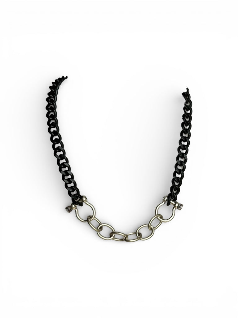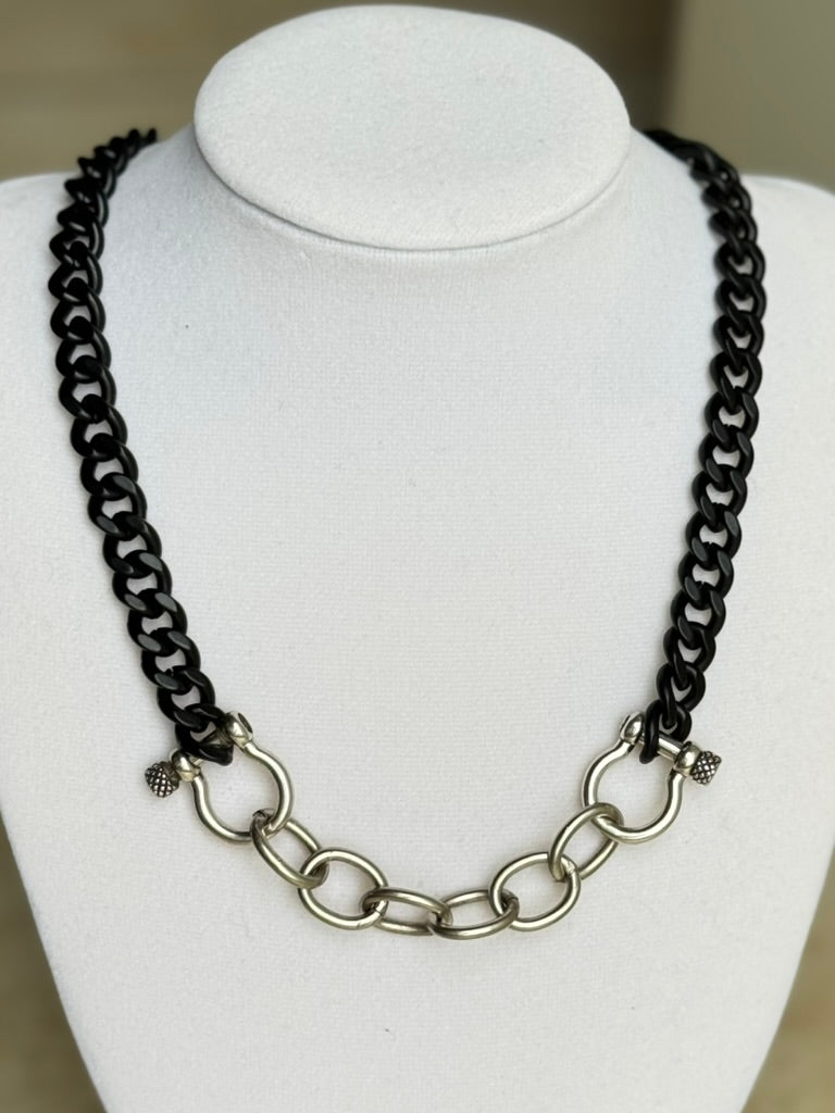 Make a statement with the Aspen—a bold matte black heavy link chain that commands attention. The center gleams with a striking silver accent chain, anchored on both sides by sleek silver carabiner locks that add an edgy, functional touch. Perfect for layering or wearing solo, this necklace blends tough-girl vibes with refined elegance. Versatile enough for everyday wear yet distinctive enough to turn heads.