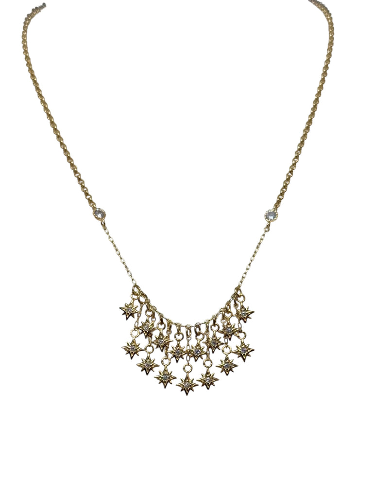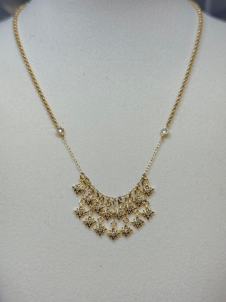 SKU CB756-NTiny star charm droplets cascade gracefully from a delicate gold chain, creating an effortlessly chic accessory that adds just the right touch of sparkle to any look. This playful piece brings a dreamy, celestial vibe to your everyday style. Lightweight and versatile, it's the kind of necklace you'll reach for again and again.