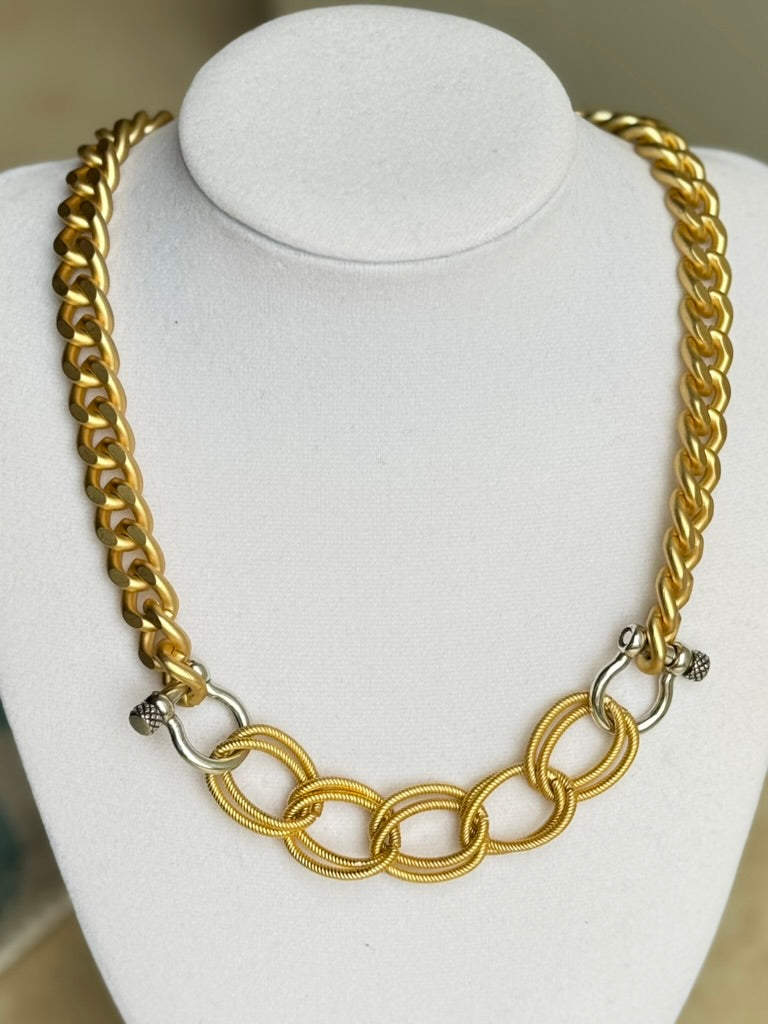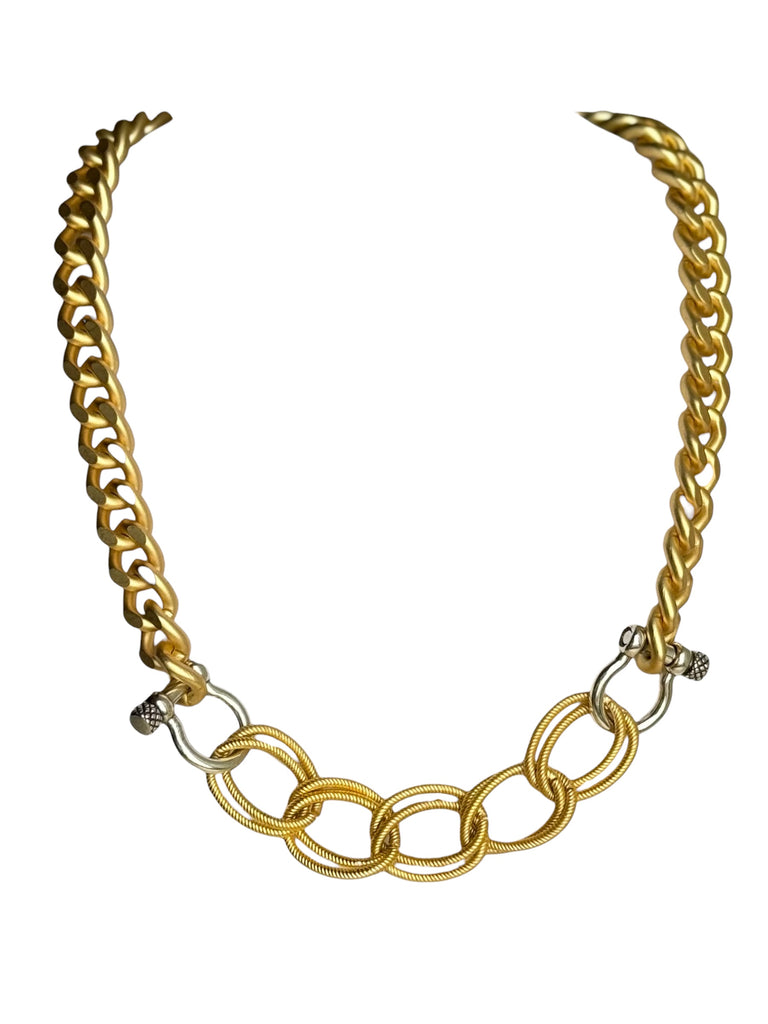 SKU CB760-NFairfield is the necklace that does the heavy lifting. Matte gold links chain together with serious attitude, anchored by a textured double-link chain centerpiece that catches the light just right. Carabiner locks keep everything locked down—literally—giving you that edgy, cool vibe that pairs perfectly with a white tee and denim jacket. Bold enough to make a statement, refined enough to wear again tomorrow.