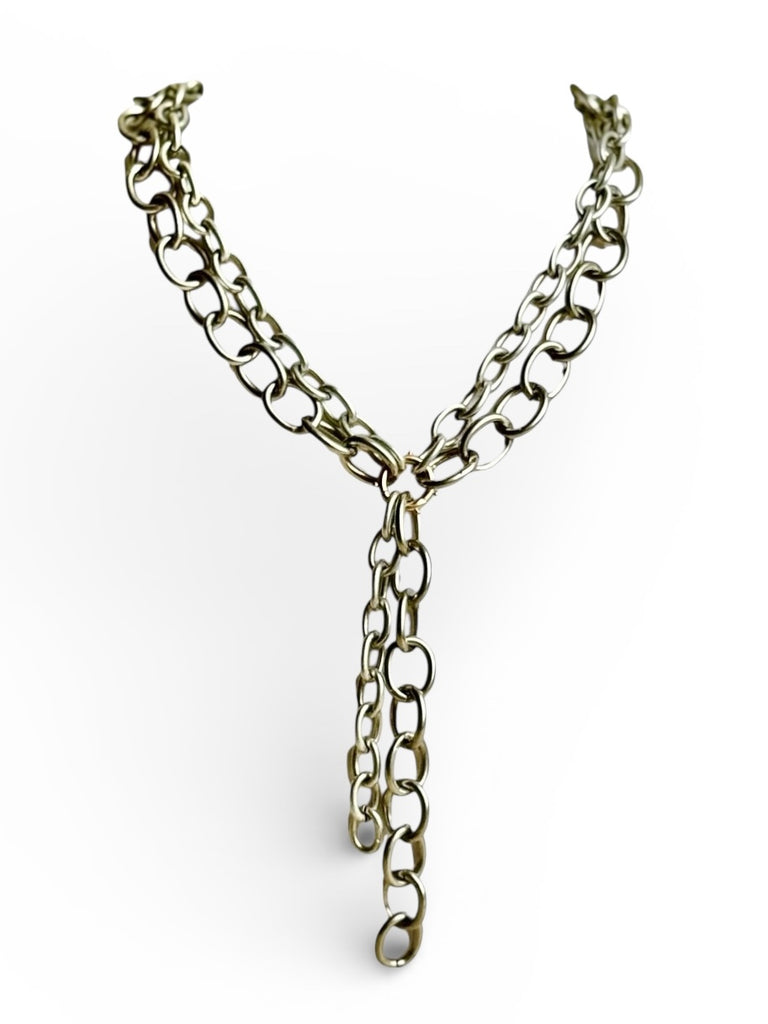 SKU CB758-NIntroducing the Wrinks—a delightfully unexpected necklace that plays with proportion and charm. This smooth oval link chain features a clever double-strand design in antique silver, unified by a gold circle accent that holds the "Y" formation together. The interplay of metals and the geometric twist make it a conversation starter that works equally well layered or worn solo. Perfect for adding a touch of whimsy to your everyday look.