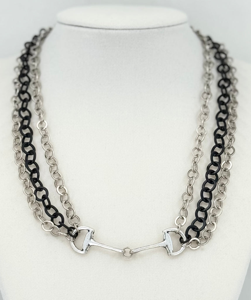 SKUElevate your style with the Double Nicks necklace, featuring a horse bit accent that exudes timeless elegance. Its antique silver finish paired with a jet black chain creates a striking contrast, making it a sophisticated statement piece for any occasion. The blend of classic design and bold color adds depth to your look, perfect for enhancing both casual and formal ensembles.