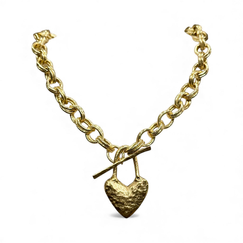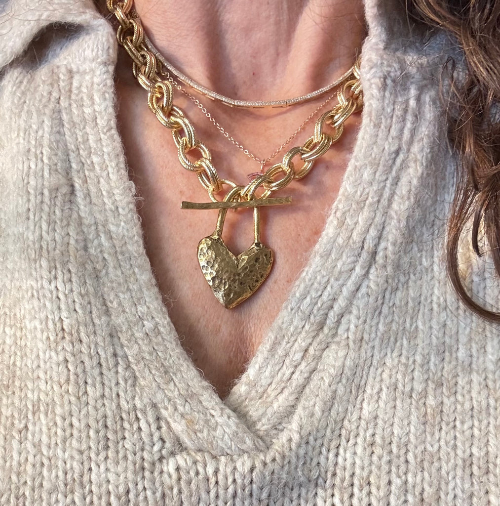 SKU CB754-NMake a bold statement with the Lisa necklace, where a striking hammered antique gold heart toggle takes center stage. This edgy-chic piece speaks to the fashion-forward crowd who refuse to blend in. The textured heart clasp isn't just functional—it's a conversation starter that transforms your everyday look into something undeniably cool. Layer it, wear it solo, or let it be the star of your jewelry collection. Perfect for those who embrace their unique style with confidence.